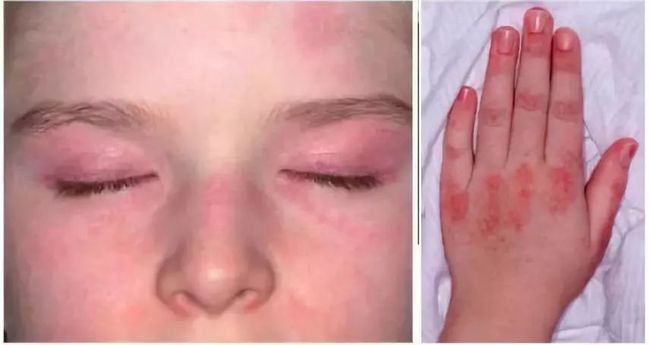 患儿可出现多种多样的皮肤表现,如面部皮疹(向光性、日射性),特征是在眼周和颧部呈现暗紫色的皮疹,且可波及鼻唇沟,也可在指间关节部位出现红斑和苍白色萎缩性皮肤改变(Gottron征)以及甲床和血管扩张。